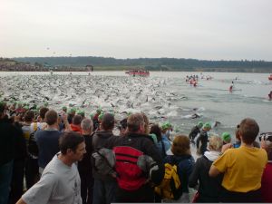 Die Uhr zeigte 06.50 Uhr an, langsam, aber sicher, wurde es ernst. Ich begab mich zum Wasser und schwamm mich kurz ein. Wegen meiner Rippenverletzung versuchte ich mich aus dem Getümmel raus zu halten und ordnete mich ziemlich weit links ein. Die erste Gänsehaut bekam ich als das Gebet gesprochen und die Nationalhymne gespielt wurde. Eine unbeschreibliche Stimmung. Startschuss, vor lauter Nervosität vergaß ich meine Stoppuhr zu starten. Meine Taktik ging auf und ich schaffte es mich aus dem großen Hauen und Stechen rauszuhalten. An der ersten Boje wurde es etwas eng, aber das legte sich sehr schnell wieder. Allerdings sah ich dann beim nach rechts Atmen sehr viele schwarze Gestalten bereits bei einem nicht eingeplanten Landgang, der durch eine Sandbank entstanden war.