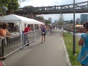 Trotz der Euphorie der Zuschauer nahm ich den „Heart Break Hill“ nun, anders als in der ersten Runde, als Anstieg wahr. Bei der Abfahrt nach Frankfurt , mit leichtem Gegenwind, versuchte ich, meine Beine schon etwas zu lockern und mich auf die vier Laufrunden am Main einzustellen. Nur nicht an einen Marathon denken. Es war für mich ein unglaubliches Gefühl, mit etwa 40 bis 45 h/km durch Frankfurt „zu heizen“, da dies während meiner Trainingsfahrten aufgrund einiger Umstände nie möglich war. Meine Radzeit betrug 5h 58Min, eingeplant hatte ich 6 Stunden. Also, bis jetzt lief alles nach Plan.